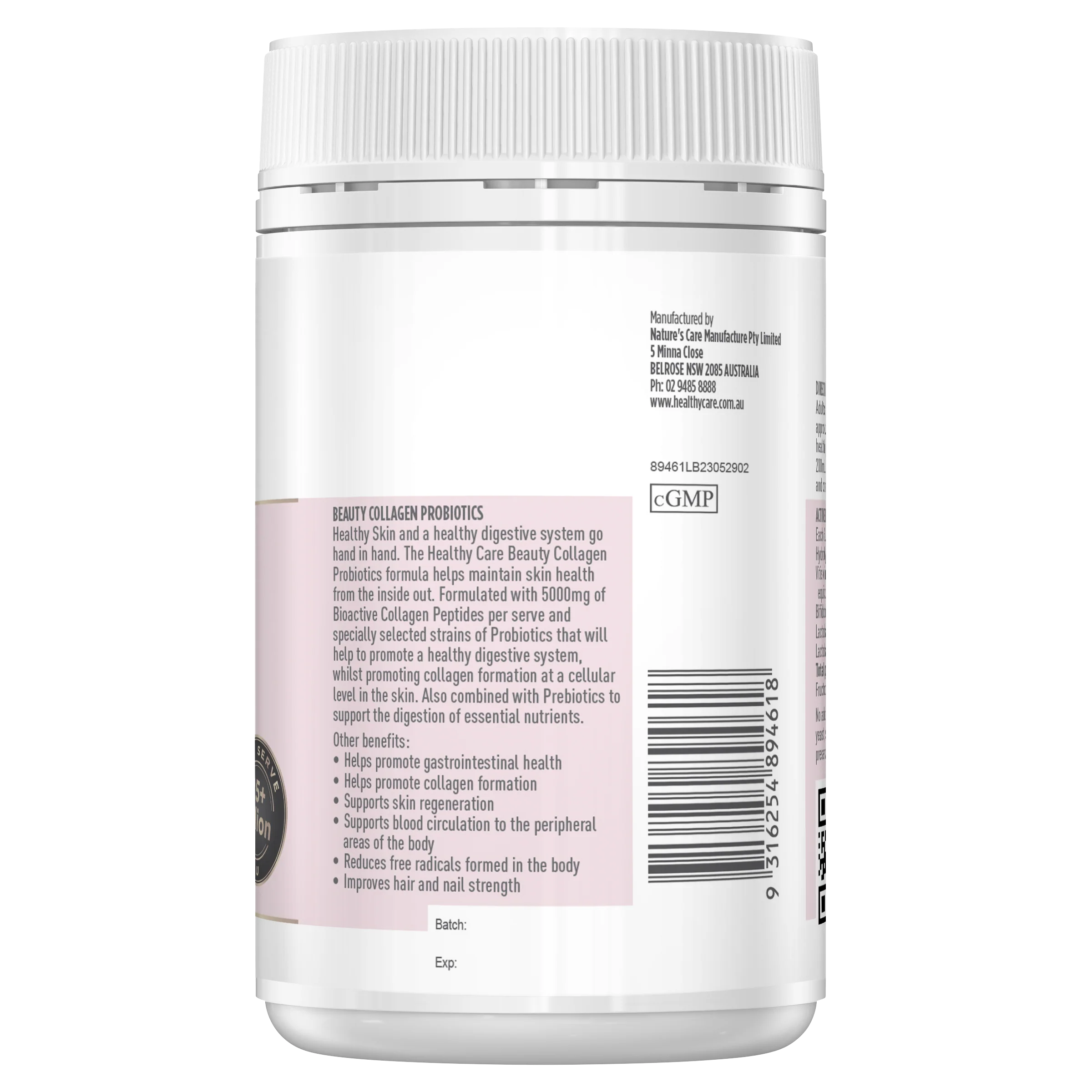 Healthy Care Beauty Collagen Probiotics is a dual-action formula designed to support both digestive and skin health. Each serve contains 5000mg of Bioactive Marine Collagen Peptides, combined with 25.2 billion CFU of selected probiotic strains and prebiotics, to nourish the gut and promote collagen formation at a cellular level.
