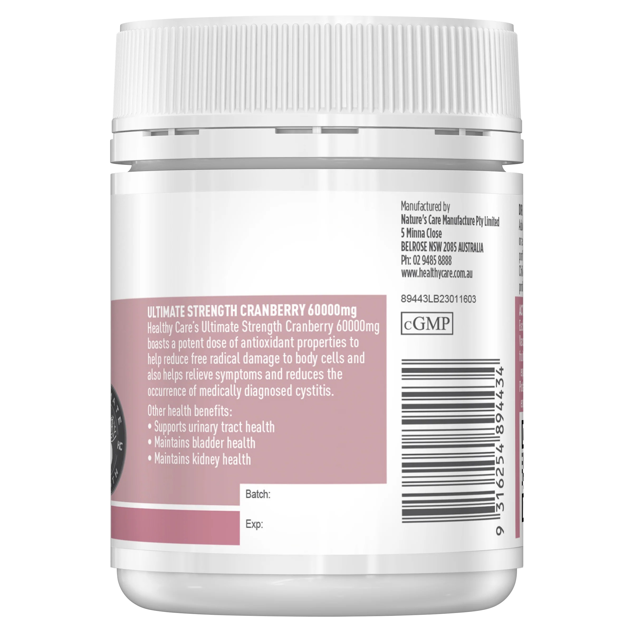 Healthy Care's Ultimate Strength Cranberry 60000mg boasts a potent dose of antioxidant properties to help reduce free radical damage to body cells and will help to relieve symptoms and reduces the occurrence of medically diagnosed Cystitis.